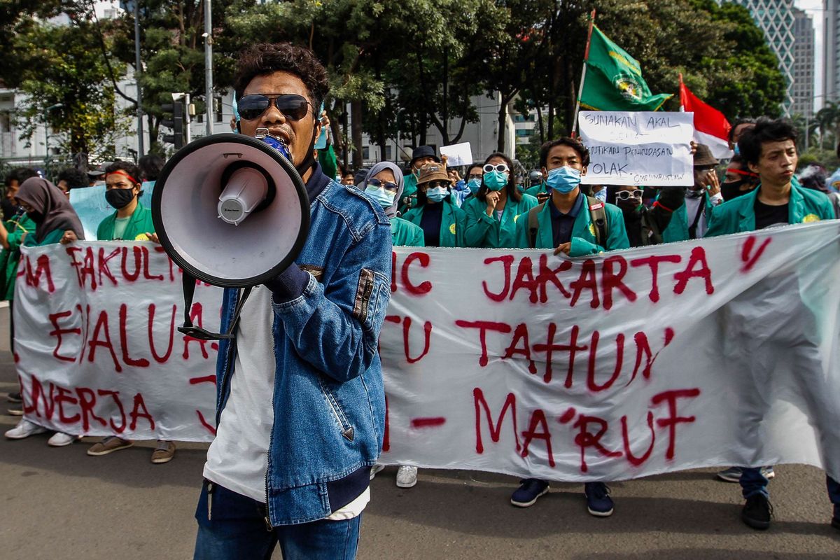 Demonstran menghadapi kepolisian di Jakarta pada...