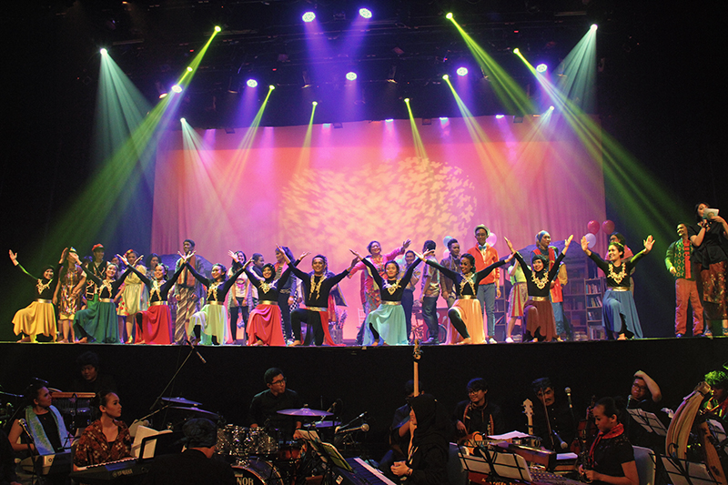 Kemeriahan penutupan drama musikal Rentak Harmoni dengan keseluruhan tim pengisi acara saat pentas di Graha Bhakti Budaya, Taman Ismail Marzuki, Sabtu (30/1).
