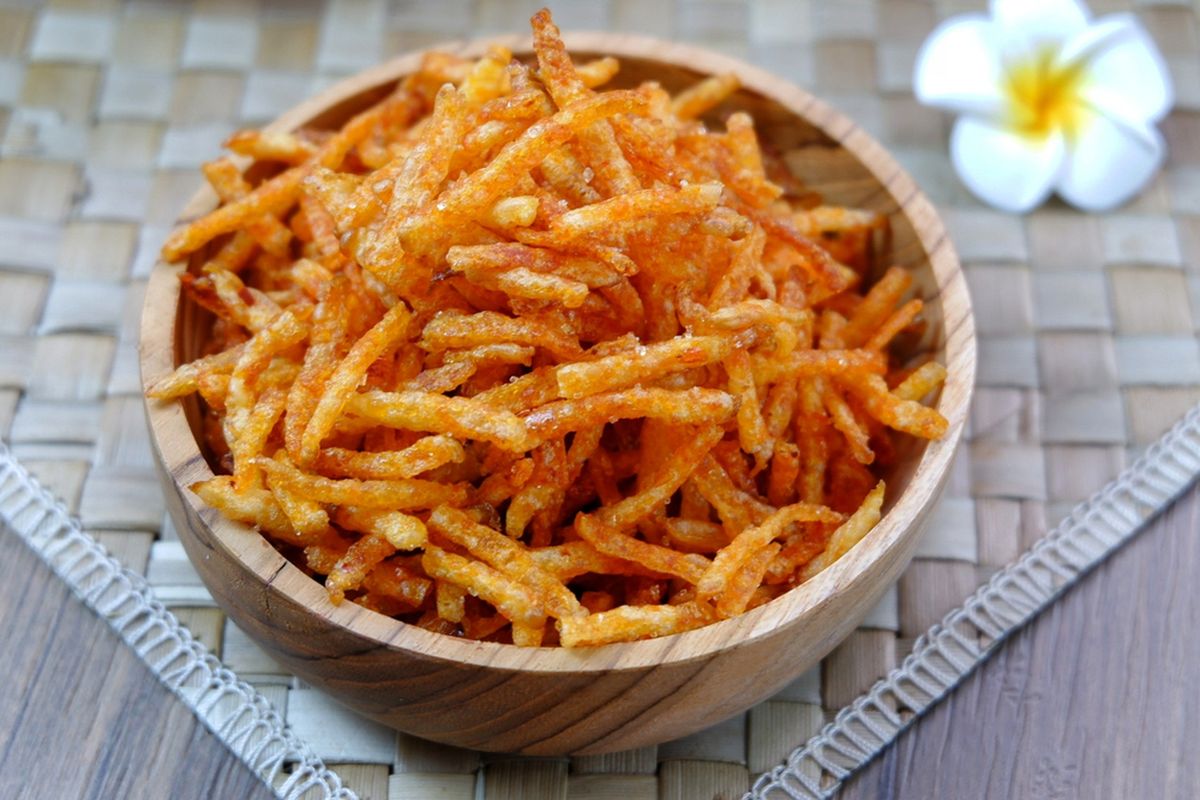 Kentang mustofa terkenal dengan tampilan pendek dan kecil menyerupai korek api yang digoreng hingga kering. Dengan cita rasa yang renyah bercampur sedikit pedas dan manis, santapan ini cocok menjadi pendamping nasi putih hangat atau sekadar dijadikan camilan.
